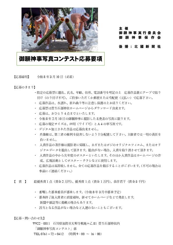 | アクセス | 【お車でお越しの場合】 ・高速道路 「加賀IC」「片山津IC」より約10分 【電車でお越しの場合】 ・北陸新幹線 「JR加賀温泉駅」 ・普通列車 「IR加賀温泉駅」 ・普通列車 「IR大聖寺駅」 駅からは車が便利です。 徒歩の場合30分程度かかります。 【バスでお越しの場合】 ・キャンバス「加賀温泉駅」→「菅生石部神社」 ・加賀バス「加賀温泉駅」→「岡町」🚶 ・加賀バス「大聖寺駅」→ 「岡町」🚶 ・加賀バス「大聖寺駅」→「菅生」🚶 ※ 各交通機関にご確認ください。 |